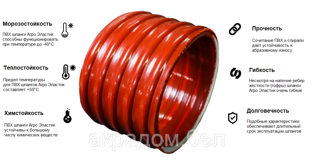 Шланг устойчив к ультрафиолету, атмосферным явлениям, а также к воздействию большого числа химических веществ.