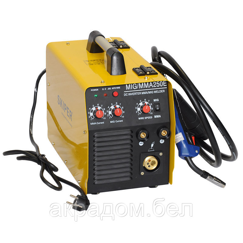 Двухвариационный аппарат дуговой сварки с возможностью варить проволокой и электродом. Максимальное потребление 4.2 кВт. Данный аппарат отлично подходит для работ в садовых товариществах, сельской местности, гаражных кооперативах. Комплектуется кабелем с клеммой заземления, электрододержателем, съёмным еврорукавом, сварочной горелкой (промразъёмом), щитком сварщика, щеткой для чистки шлака.